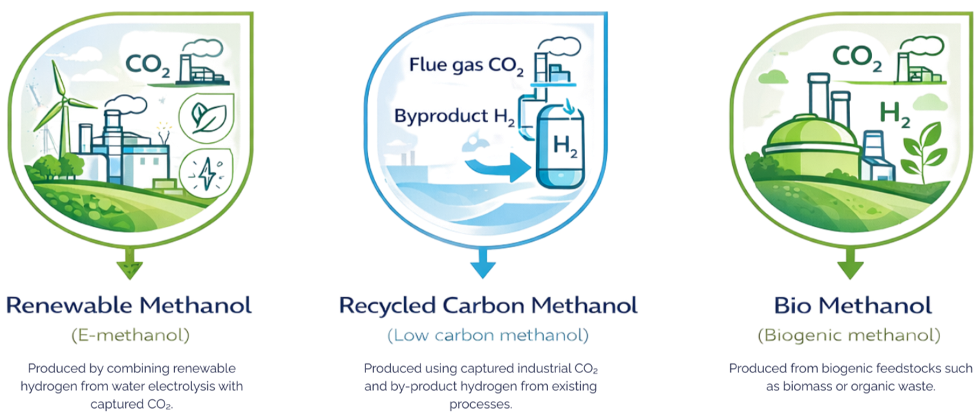 All types of methanol are chemically identical, but the feedstocks, energy sources and production pathways differ, influencing the overall carbon footprint.